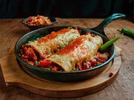 7Naplnené tortilly zalejeme zvyškom BUITONI Sugo Fino Di Pomodoro a posypeme cheddarom.