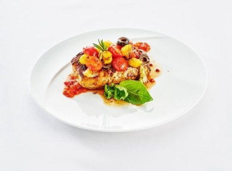 Teľací steak s rozmarínom a ružovým korením, s čiernymi olivami a cherry paradajkami