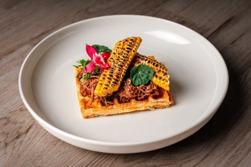 Vafle s pikantným trhaným hovädzím a jalapenos papričkami