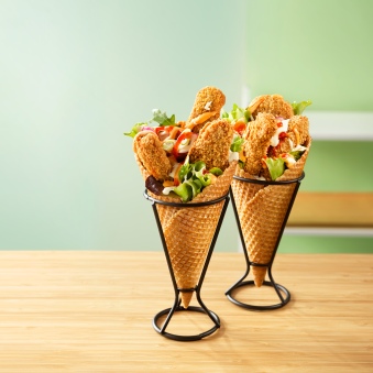 Do vaflového kornúta vložíme šalátové listy a potom GARDEN GOURMET® Sensational™ vegánske stripsy. Pokvapkáme sriracha majonézou.